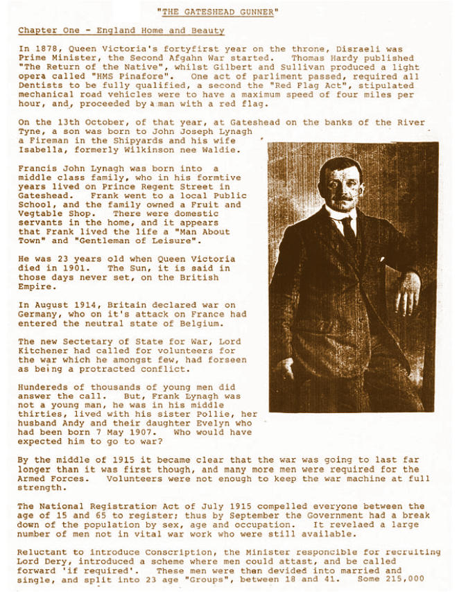This website contains content from the reference book ‘Life and times of Francis John Lynagh: the Gateshead Gunner’ by Jim Parker. Copies of the book are held in Gateshead library : search https://libraries.gateshead.gov.uk/home The biography was commissioned in 1992 by the daughter of Francis Lynagh. Copyright 2019, All rights reserved. This site is dedicated to remembering those that fought and in many cases died for their country.